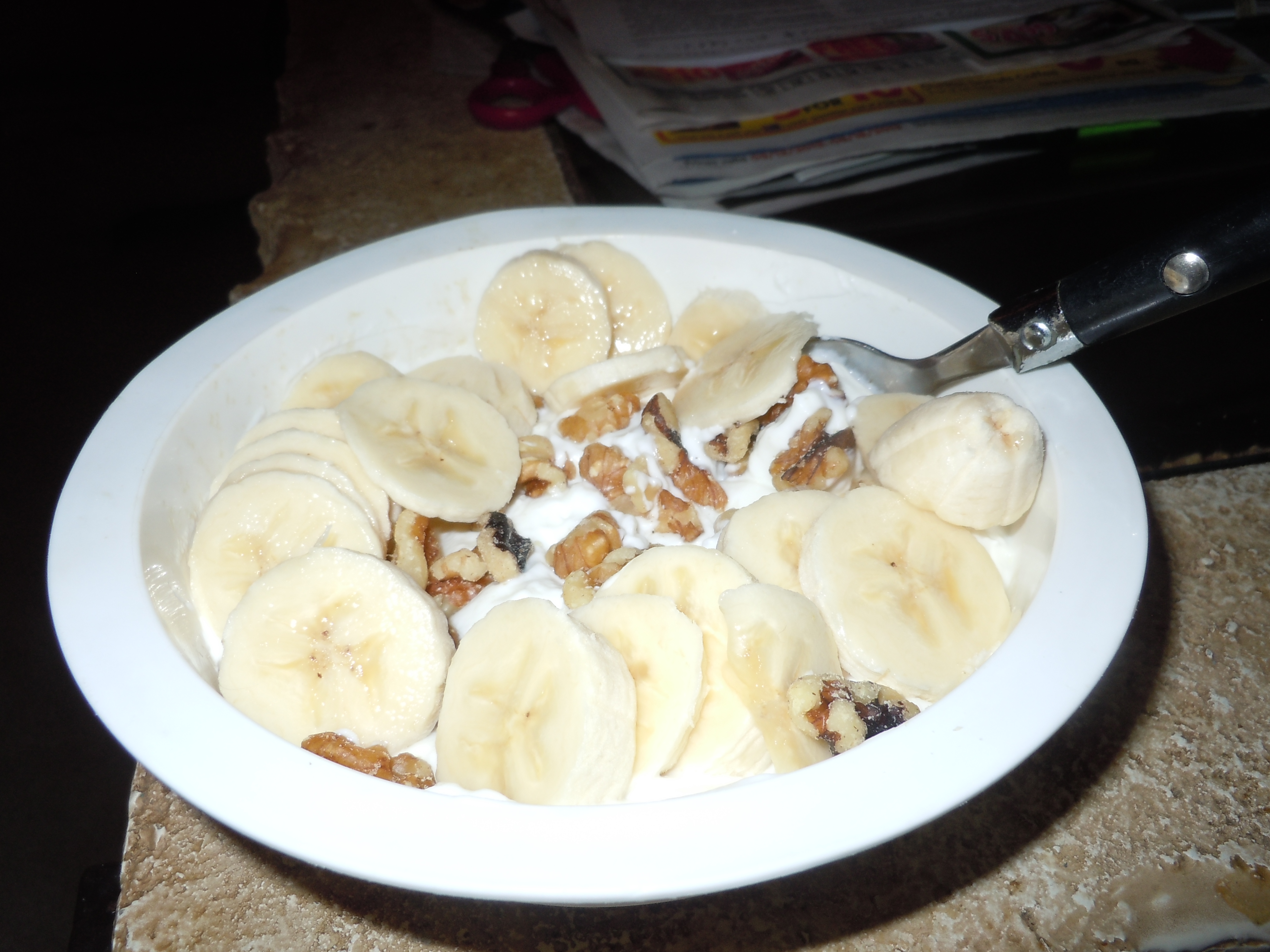 Mix the first six ingredients in a bowl and nuke it for about two minutes. After it’s not so hot anymore, slap on the banana slices and dap the yogurt on it.